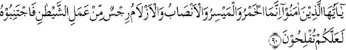 Artinya: “Wahai orang-orang yang beriman! Sesungguhnya minuman keras, berjudi, (berkurban untuk) berhala, dan mengundi nasib dengan anak panah adalah perbuatan keji dan termasuk perbuatan setan. Maka jauhilah (perbuatan-perbuatan) itu agar kamu beruntung.” (Q.S. al-Maidah/5:90)
